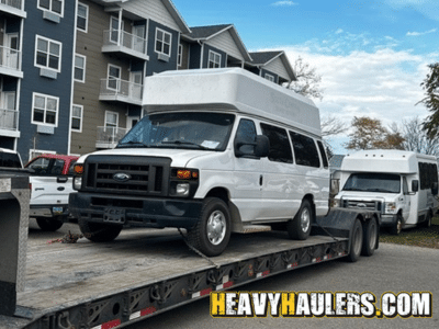 Transporting a Ford E350 Bus on a lowboy trailer