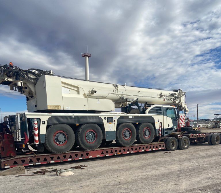 Terex Crane Truck loaded on a lowboy trailer for transport